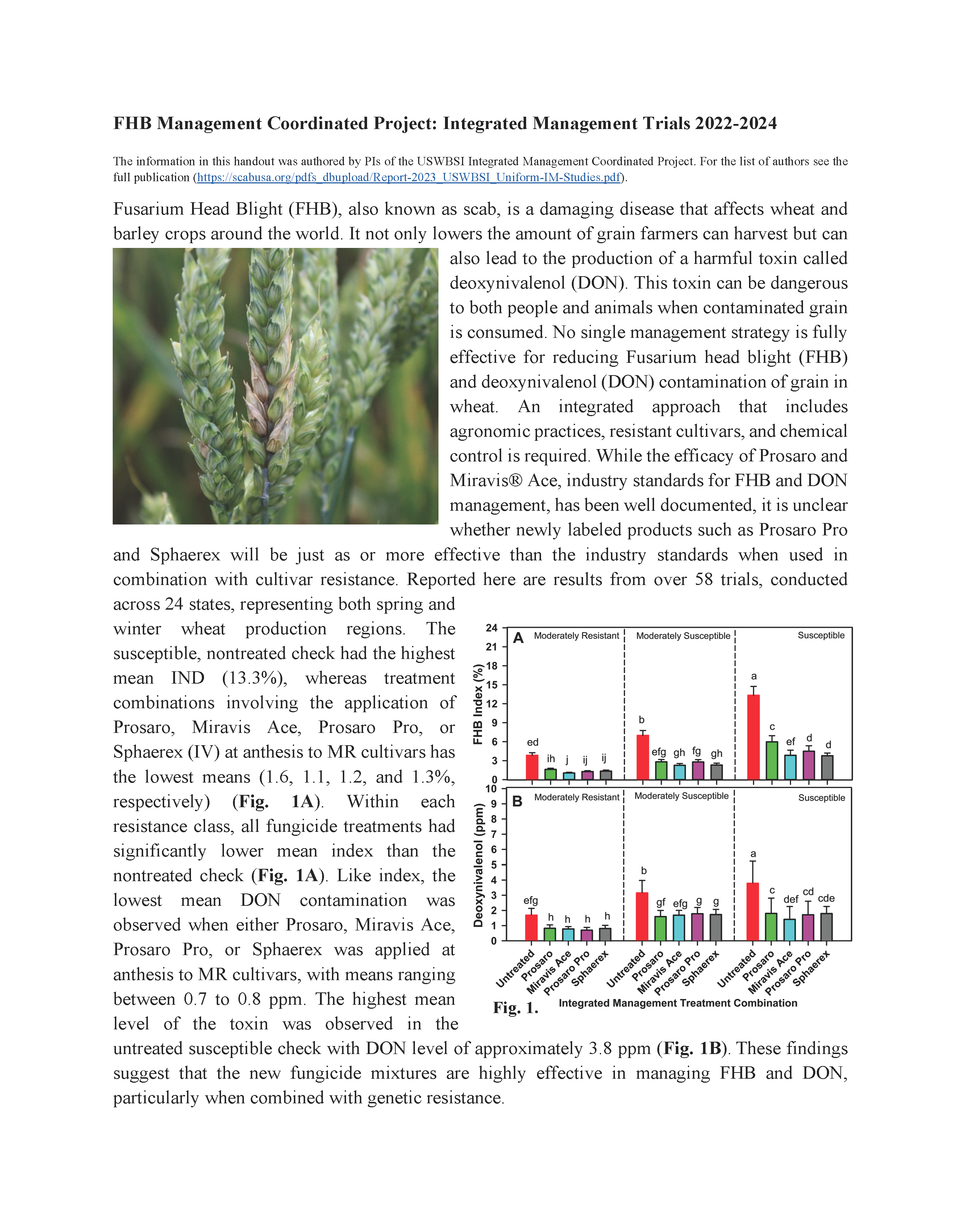 2024 Integrated Management Trials The USWBSI integrated management trials looks at incorporating genetic resistance to FHB along with fungicide applications. See how combinations of fungicides and genetic resistance hold up against FHB in this year’s study. Summary Handout | Full Handout