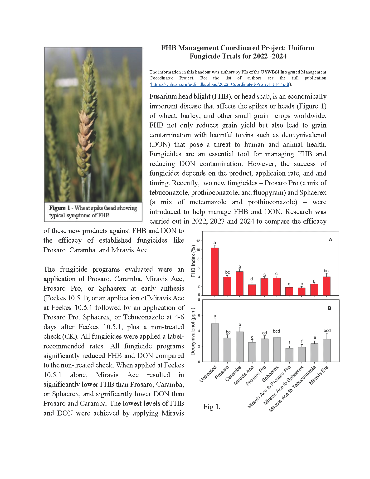 2022-2024 Uniform Fungicide Trials The USWBSI Uniform Fungicide trials tests new fungicide products labels for FHB in comparison with those commonly applied. Use this report to see how these newer fungicides stack up compared to the industry standards. Summary Handout | Full Handout