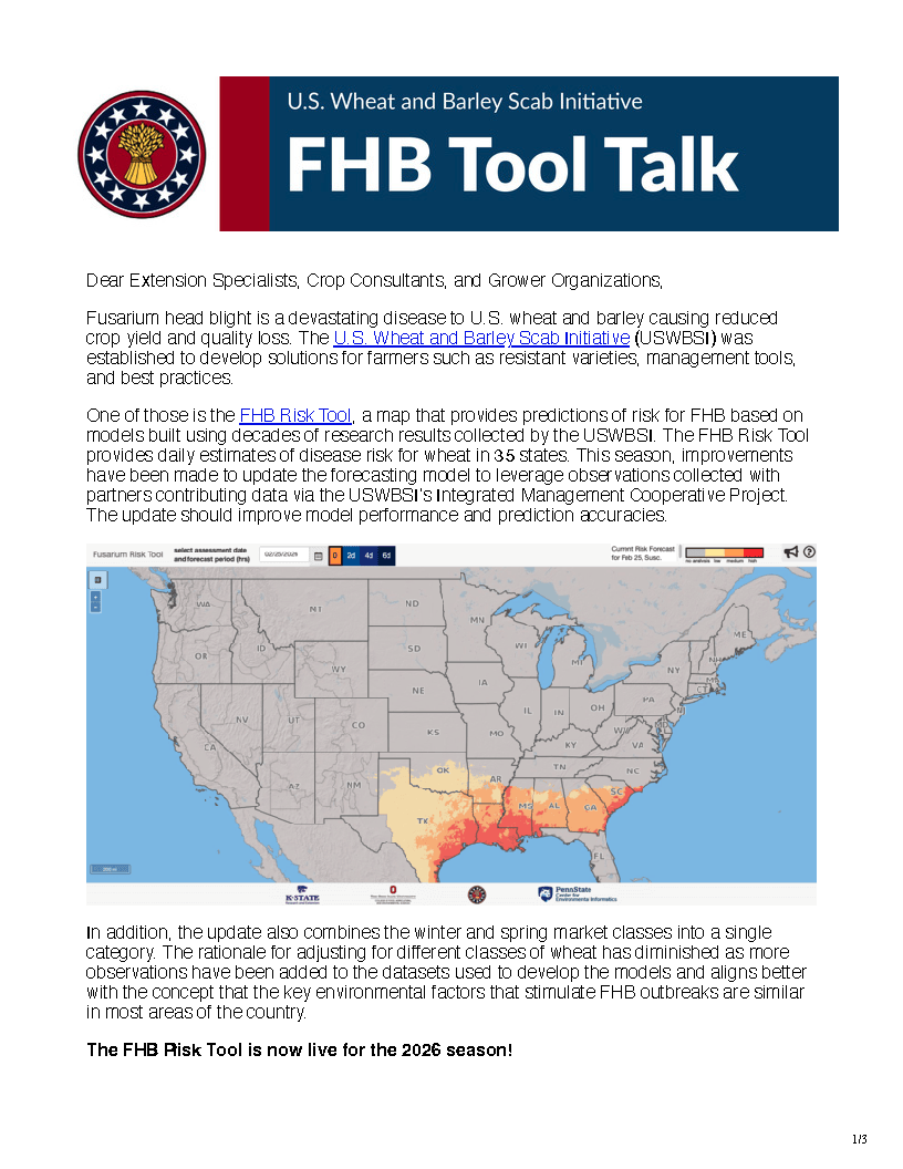 February 25, 2026: FHB Risk Tool Live for 2026 Season The FHB Risk Tool is now live for the 2026 growing season. View the map to determine infection risk and apply fungicides if warranted to prevent FHB.