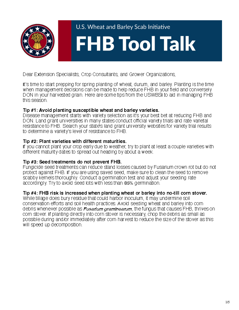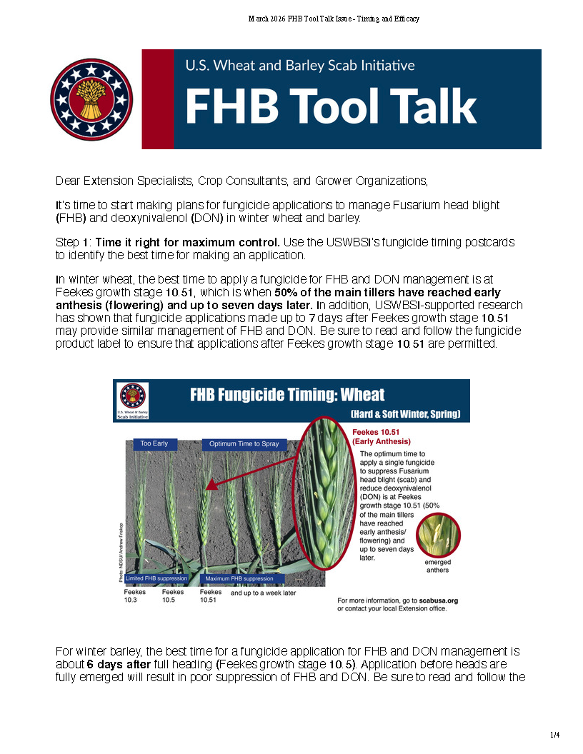 March 25, 2026: Planting Tips for Spring Wheat and Barley Planting is the time when management decisions can be made to help reduce FHB in your field and conversely DON in your harvested grain. Here are some tips from the USWBSI to aid in managing FHB this season.